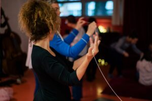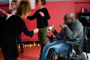 C’est être à l’écoute de toutes les expressions. Créer ensemble ses propres danses, écrire des mouvements communs à partir d’expériences inattendues, seul, à deux et en groupe.